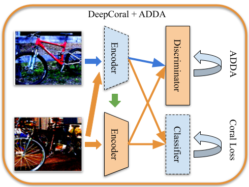 Extensive domain adaptation algorithms have been proposed to account for the degradation in performance due to domain shift. Deep Coral 4 extends the unsupervised domain adaption method Coral to learn a nonlinear transformation that is able to align correlations of layer activations in deep neural networks. Adversarial Discriminative Domain Adaptation (ADDA) 5 combines discriminative model and generative adversarial networks to learn a discriminative mapping by fooling a domain discriminator.