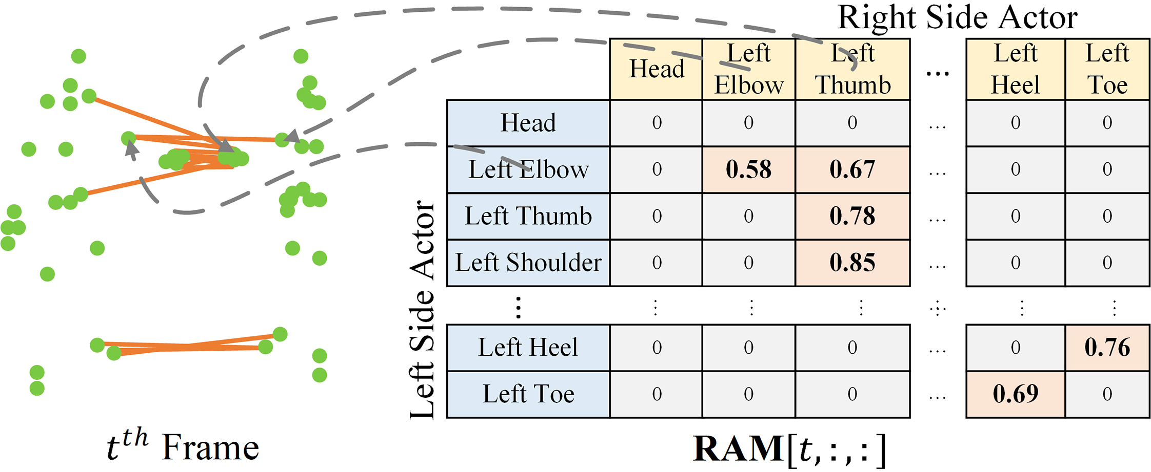 The generation and utilization are the key components of our paper. Briefly speaking, we generate the relational links, or the RAM, which represents the relational links by considering two components. They are the geometric component and the relative attention component. The geometric component is straitforward. If two joints each from one actor are close, then we consider them to be correlated. This simple assumption turns out to be very effective. For the relative attention component, we hope it can capture semantic information and connect joints that are semantically similar. We do this by first encode each joint with spatial-temporal graph convolutional layers and then calculate similarity between each joint pairs. Basing on above two component, we combine them using network-learned param and then we have the RAM.